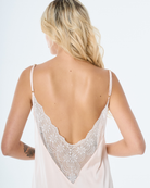 Camisolín de satén con brillo sutil y textura ultra suave al tacto, El escote en V, súper sexy, en encaje bordado que aporta feminidad y elegancia. Espalda con profundo escote en encaje.