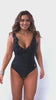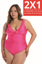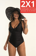 Traje de Baño escote en V, con volado. El delicado drapeado en el frente estiliza la silueta. Breteles ajustables. Corpiño con aros invisibles que brindan un sosten extra. Totalmente forrado. Faja reductora. Soft Cups.