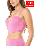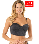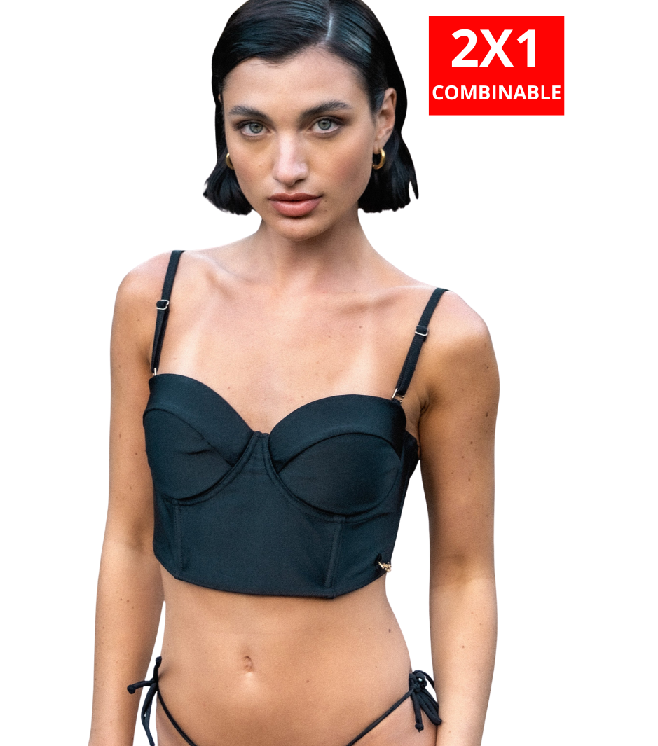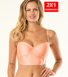 Corpiño tipo corset con shaping cups, breteles desmontables y tiras de acceso ajustables.
