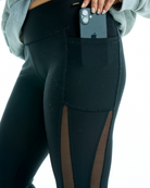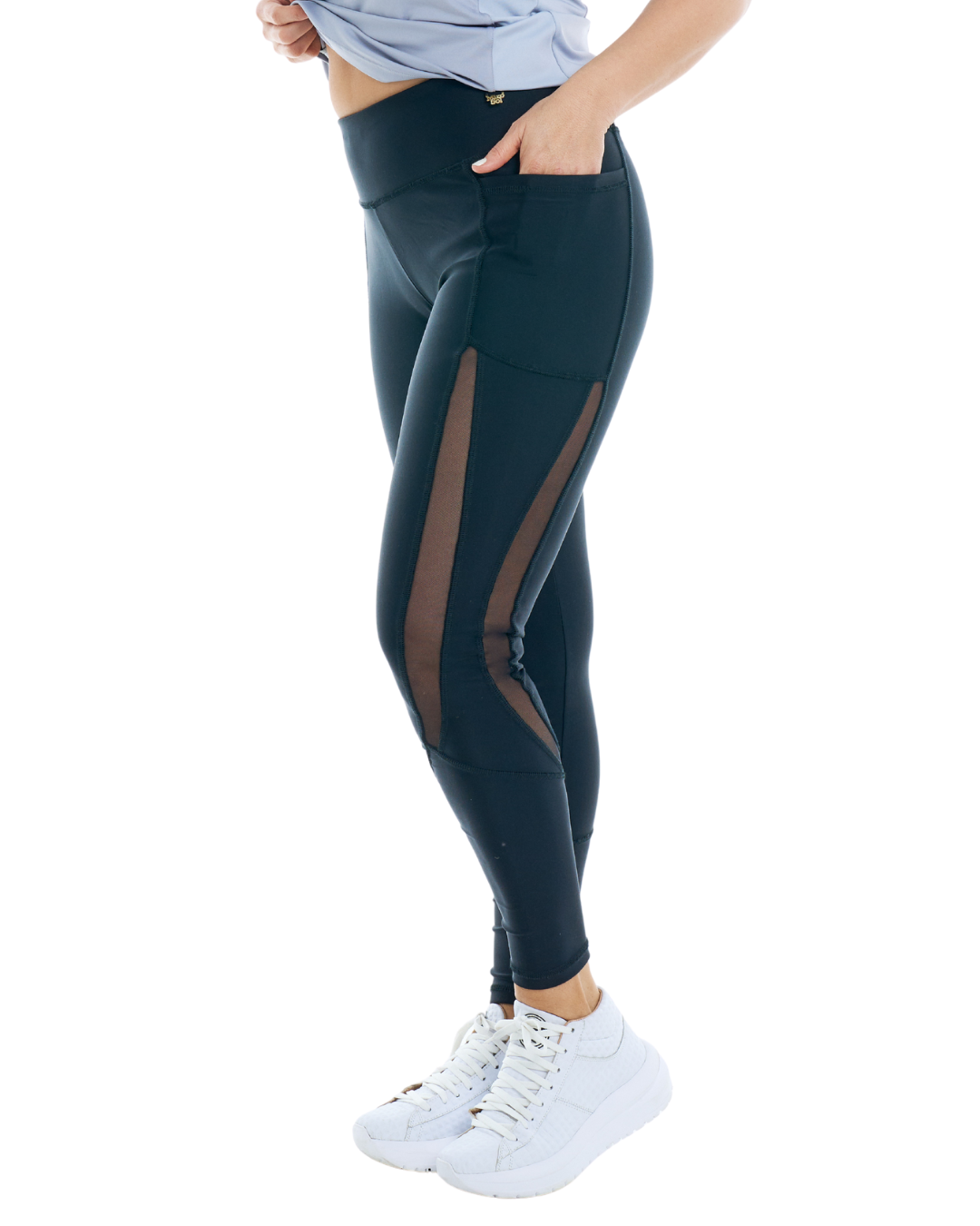 Calza con transparencias, tiro alto. Tela ultrabrillante. Bolsillos laterales.