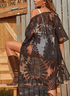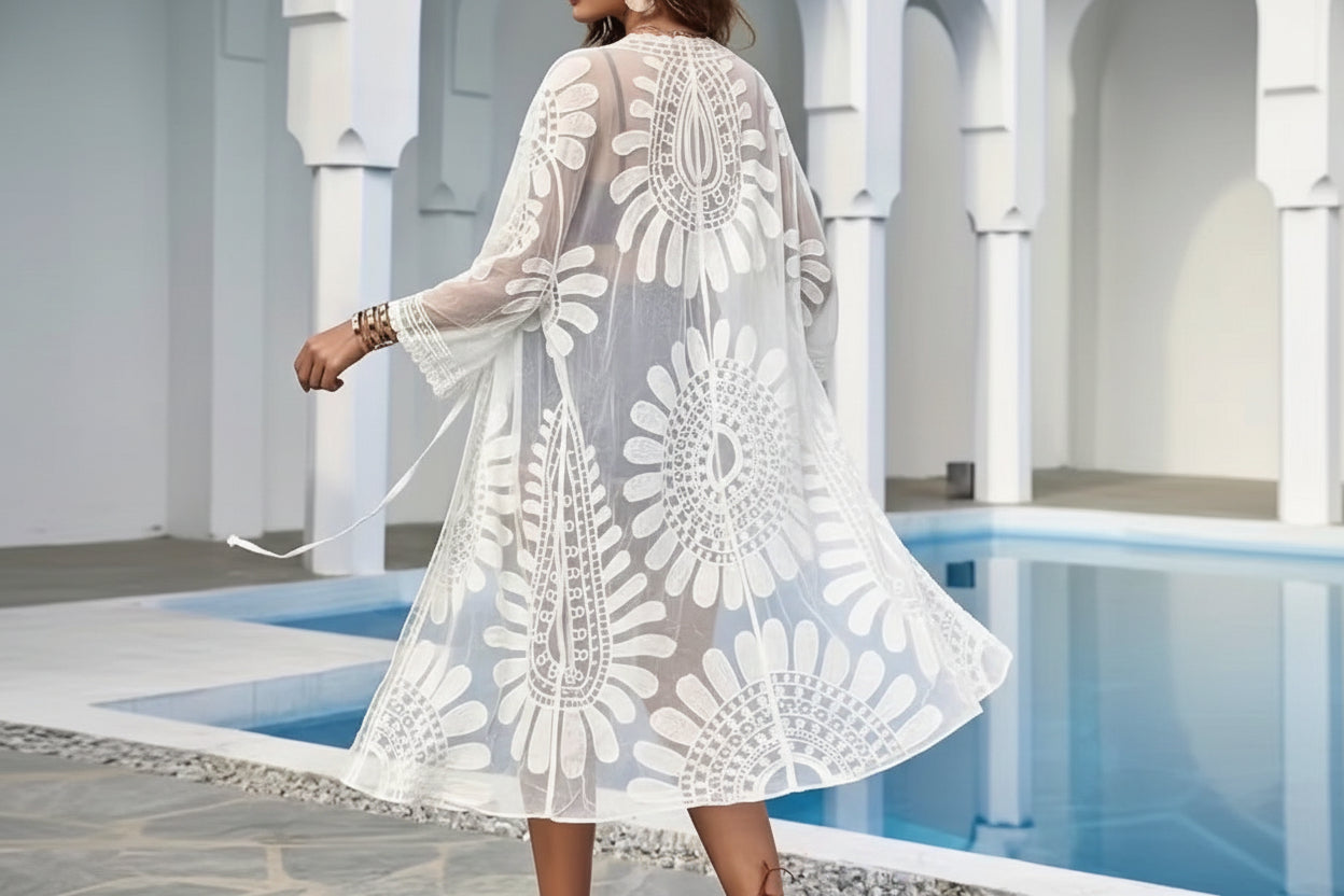 Salida de playa tejida con grandes flores caladas y mangas cortas amplias. Diseño suelto que aporta un aire romántico y femenino. Ideal para llevar sobre la malla y lograr un look elegante y veraniego.