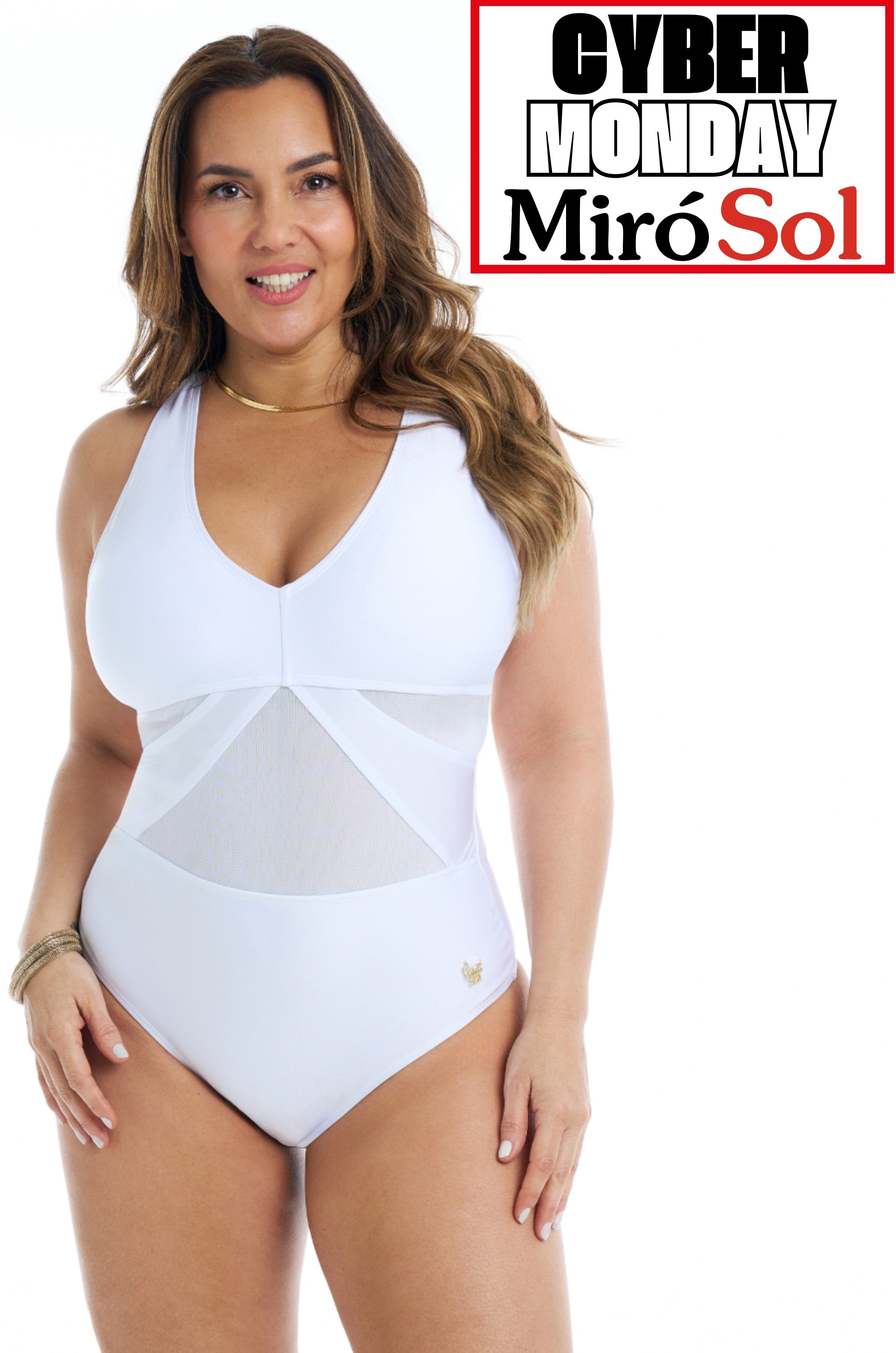Traje de Baño con escote en V y Transparencias. Su diseño geométrico estiliza la figura. Tiras cruzadas en la espalda.