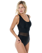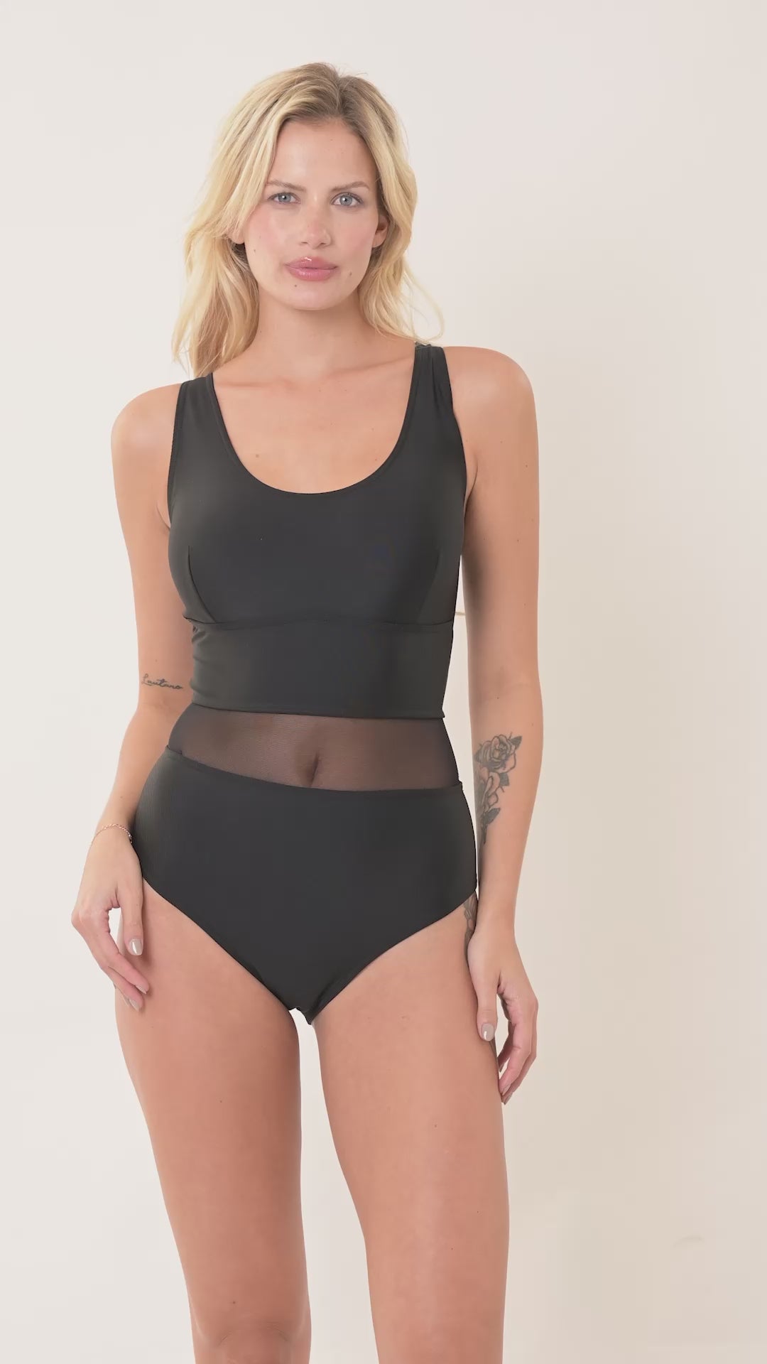 ¡NUEVA! Malla negra con detalles en transparencia que aportan un toque moderno y femenino. Con tiras regulables que permiten ajustar el calce para mayor comodidad y sujeción.