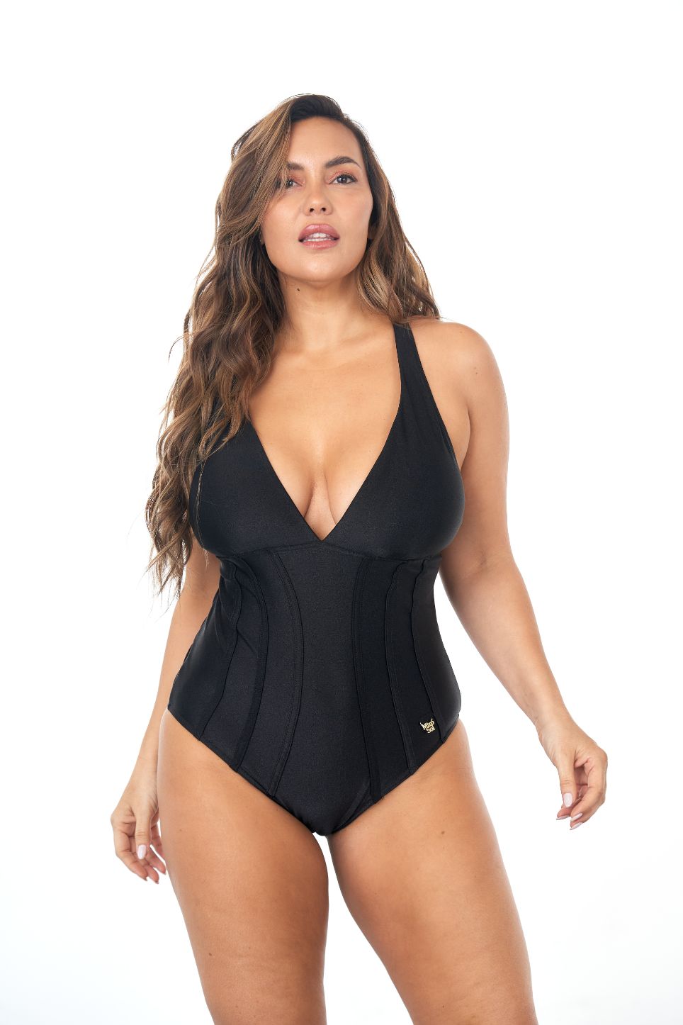 ¡NUEVO! Traje de baño entero, con un diseño ultramoderno que simula un corset, escote profundo y breteles ajustables que cruzan en la espalda. Faja reductora.